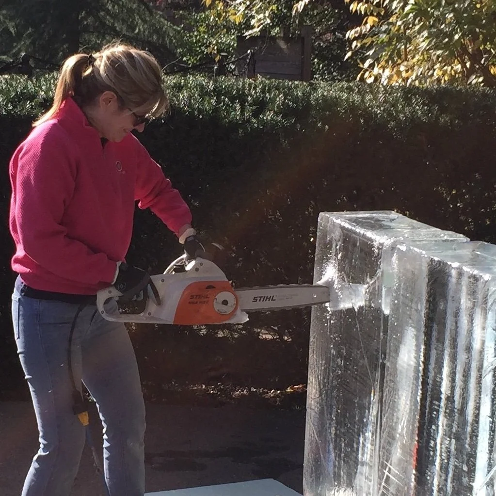 I had never sculpted with a chain saw, much less carved ice with one, which demands a very different technique so the blade does not skitter off the ice and into one's leg. In preparation for the competition, I was able to squeeze in thirty minutes of practice using a chain saw on a party-store block of ice…as it rapidly melted during the balmiest December on record in Washington, DC.